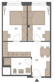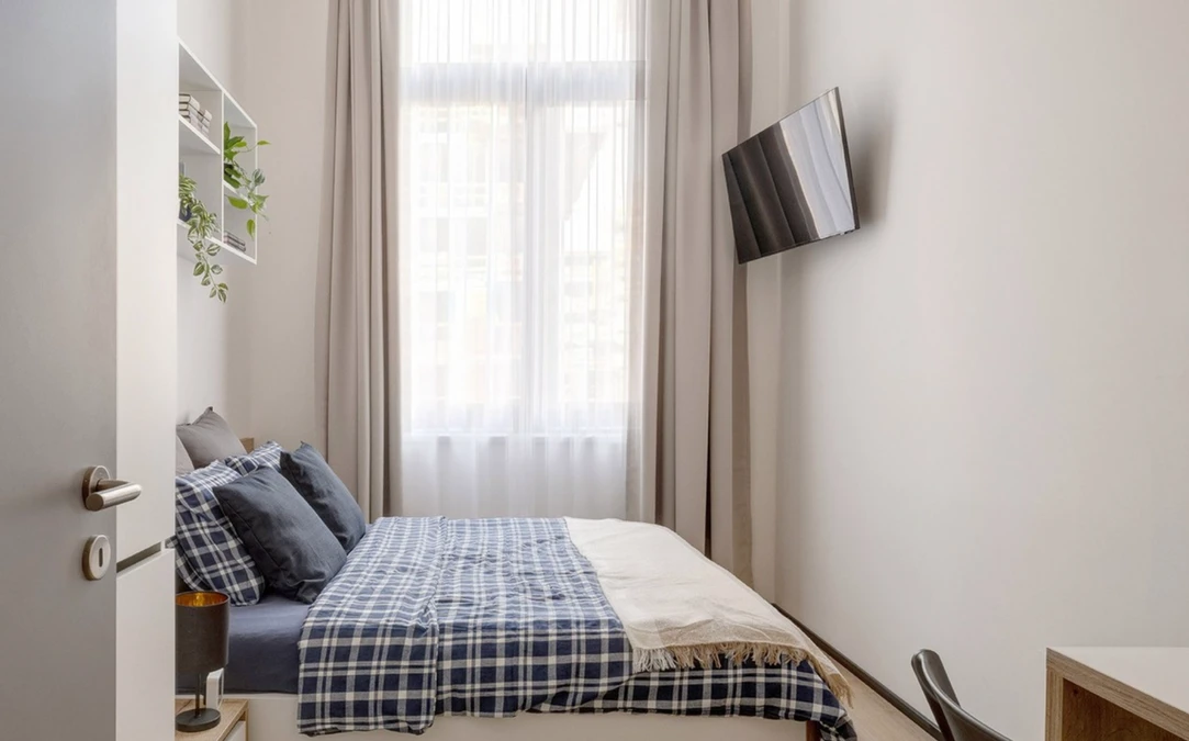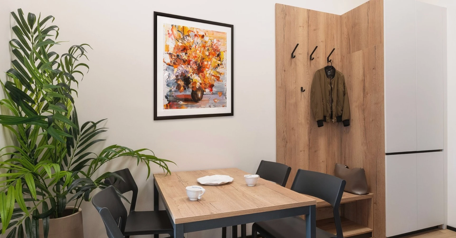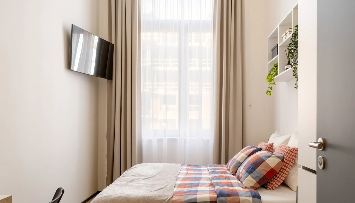 Bright flat with two separate rooms in the heart of Prague. Spacious shared living room comes with a large kitchen, dinig table for 6 persons, folding sofa and a TV set. The entry foyer offers multiple storage compartments with LED lighting.